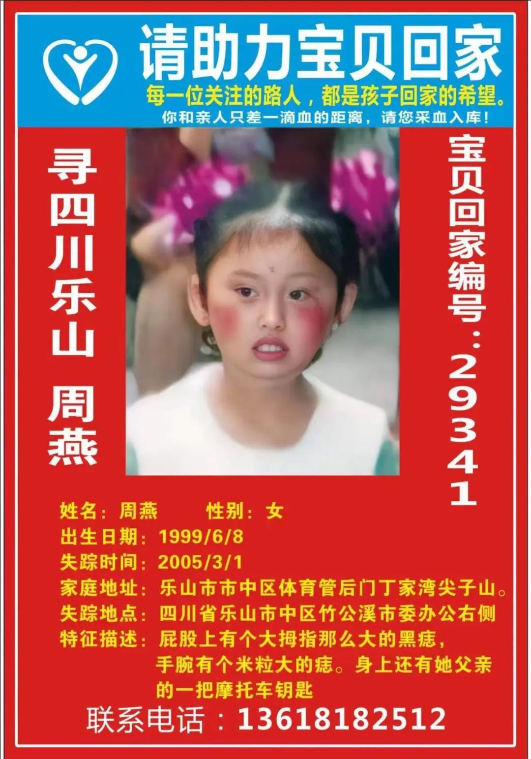 许秀莲还告诉极目新闻记者,女儿知道自己的名字叫周燕,也知道爸爸叫周友明,妈妈叫许秀莲,屁股上有一个大拇指大小的黑色胎记,手腕上有颗米粒大小的黑痣,左脚脚踝被邻居家的狗咬出过伤疤。女儿失踪当天晚上,许秀莲和丈夫在暴风雨中找了一夜都没找到,次日天亮后又去派出所立了案,还请人在乐山城内外张贴寻人启事。第三天,有的士司机看到寻人启事后告诉他们,周燕失踪当天他在事发地附近的一个桥头看到,有个女孩被几人强行拖上了车,女孩边哭边挣扎。许秀莲怀疑,这个被强行拖上车的女孩子就是周燕。张贴寻人启事后,夫妻俩得到多条线索,但都没有找到女儿的踪迹。