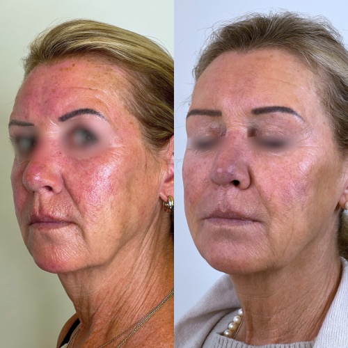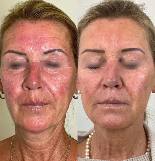 一名 54 岁女性,高加索患者,多年来患有严重的 I 型酒渣鼻,在脸上分 3 次接受了 2 毫升 GOURI治疗。GOURI每隔4周在红斑区域内注射 25G 插管。治疗后出现轻微的红肿,几天后会消失。每次治疗之间,观察到肿胀和潮红以及面部红斑明显减少。此外,毛细血管扩张变得不那么明显。这些照片显示了患者在第一次治疗前以及最后一次治疗后四周的情况,共有三次疗程。