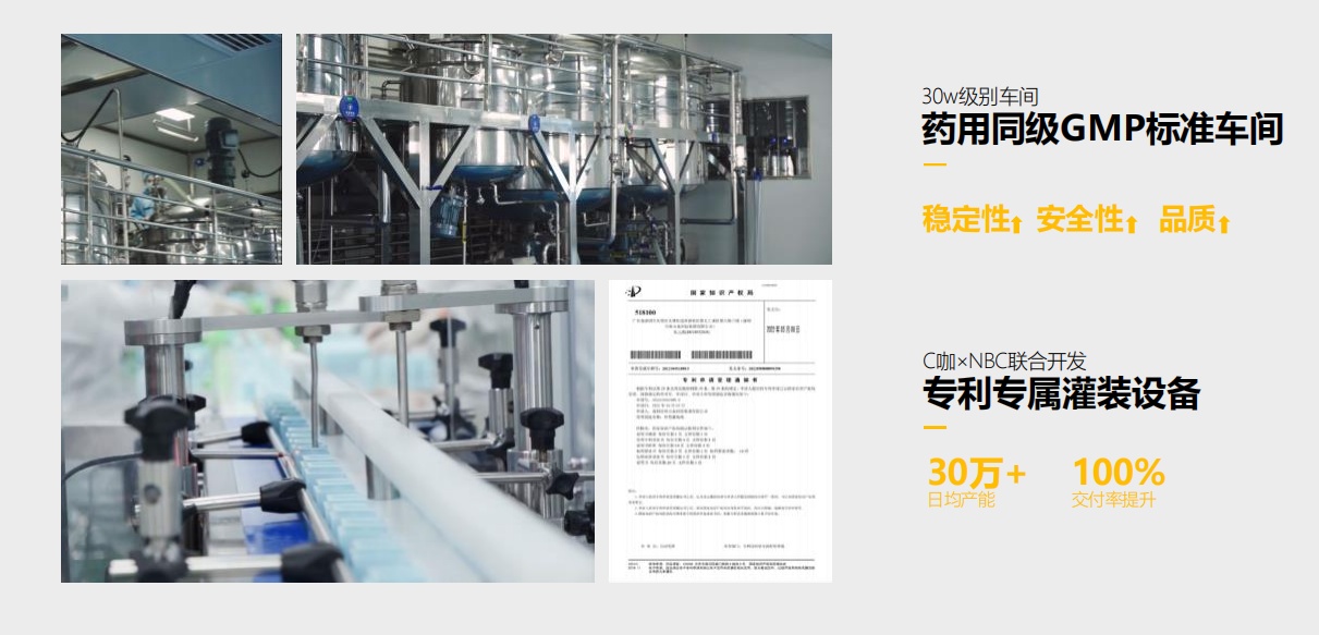 除了科研实力雄厚,C咖的生产制造实力亦不遑多让。目前,C咖与上市公司诺斯贝尔(NBC)达成了战略合作,双方共同出资建设了药用同级GMP标准洁净车间,确保出品的稳定性和安全性。同时,双方联合开发了专利专属灌装设备,不能能够有效提升日均产能和交付效率的,还能确保产品具有国际级品质。