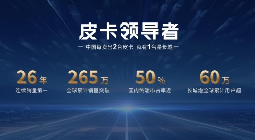 作为皮卡领导者,长城皮卡已连续26年销量第一,全球累计销量突破265万辆,国内终端市占率近50%,中国每卖出两台皮卡,就有一台是长城。长城炮品牌仅用5年时间,成为首个销量突破60万辆的中国高端皮卡品牌,已累计48个月销量过万,蝉联中国皮卡销量冠军。