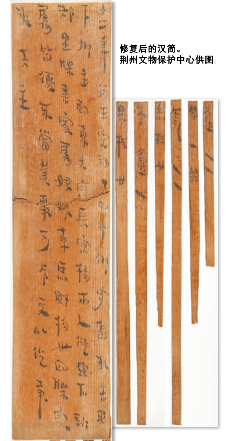 “保存状态较好的竹木简牍我们可以按工序修复,但碰到‘疑难杂症’还是得请教方主任。”荆州文保中心简牍工作室负责人史少华说。他指着电脑中的图片举例:“看,这简牍已经朽得像一根根头发丝一样了,怎么复原?”这是1973年河北定县(今定州市)一座汉墓出土的简牍,具有重要学术价值,但由于早年遭遇盗焚,竹木已经炭化,一碰就可能粉碎,字迹更无法辨认。