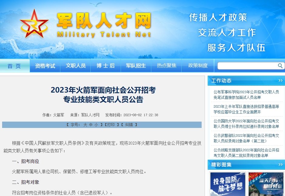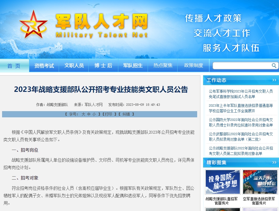 为吸引优秀退役士兵继续为国防和军队建设服务,空军计划面向全军2023年选择以自主就业方式安置的夏秋季退役军士、义务兵专项招录专业技能类文职人员,招录岗位主要为后勤管理保障和装备维护修理相关专业技能岗位,计划招录723人。有报考意愿的拟退役人员,可于8月7日至8月20日登录强军网中央军委机关网,在首页通知公告栏查看招录公告,并前往招录工作平台注册填报个人信息、扫描上传资格材料、精心选择用人单位和应聘岗位。