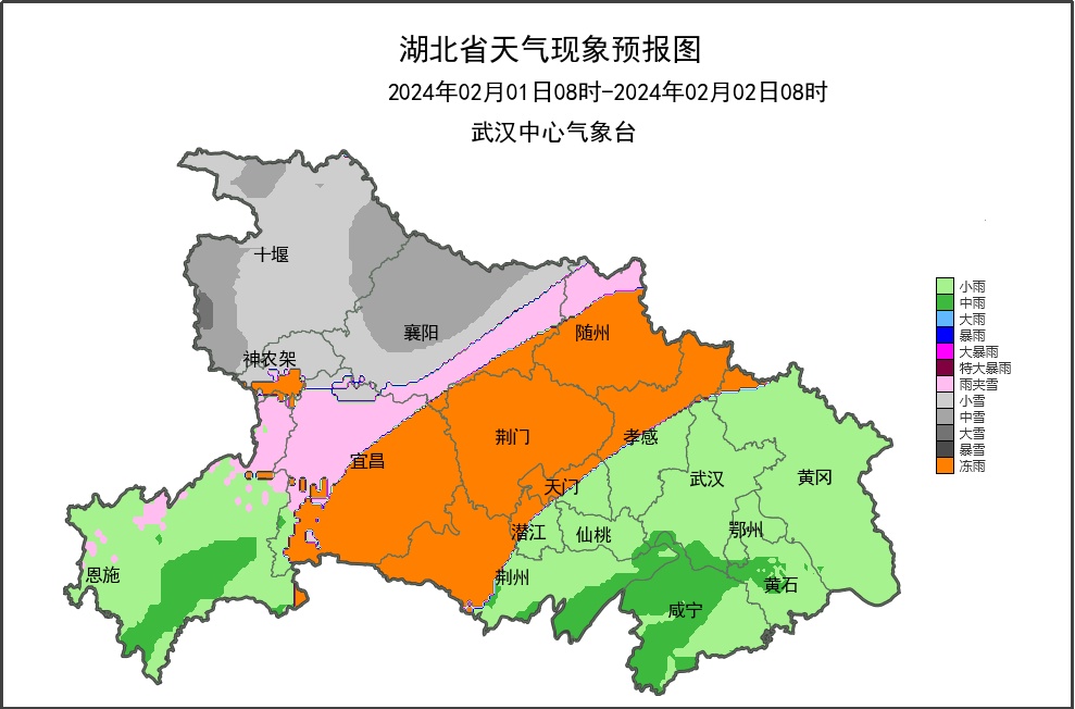 2月1日:十堰、襄阳、神农架转小到中雪,随州、荆门、孝感北部、宜昌、荆州西部转雨夹雪或冻雨,其他地区小到中雨。