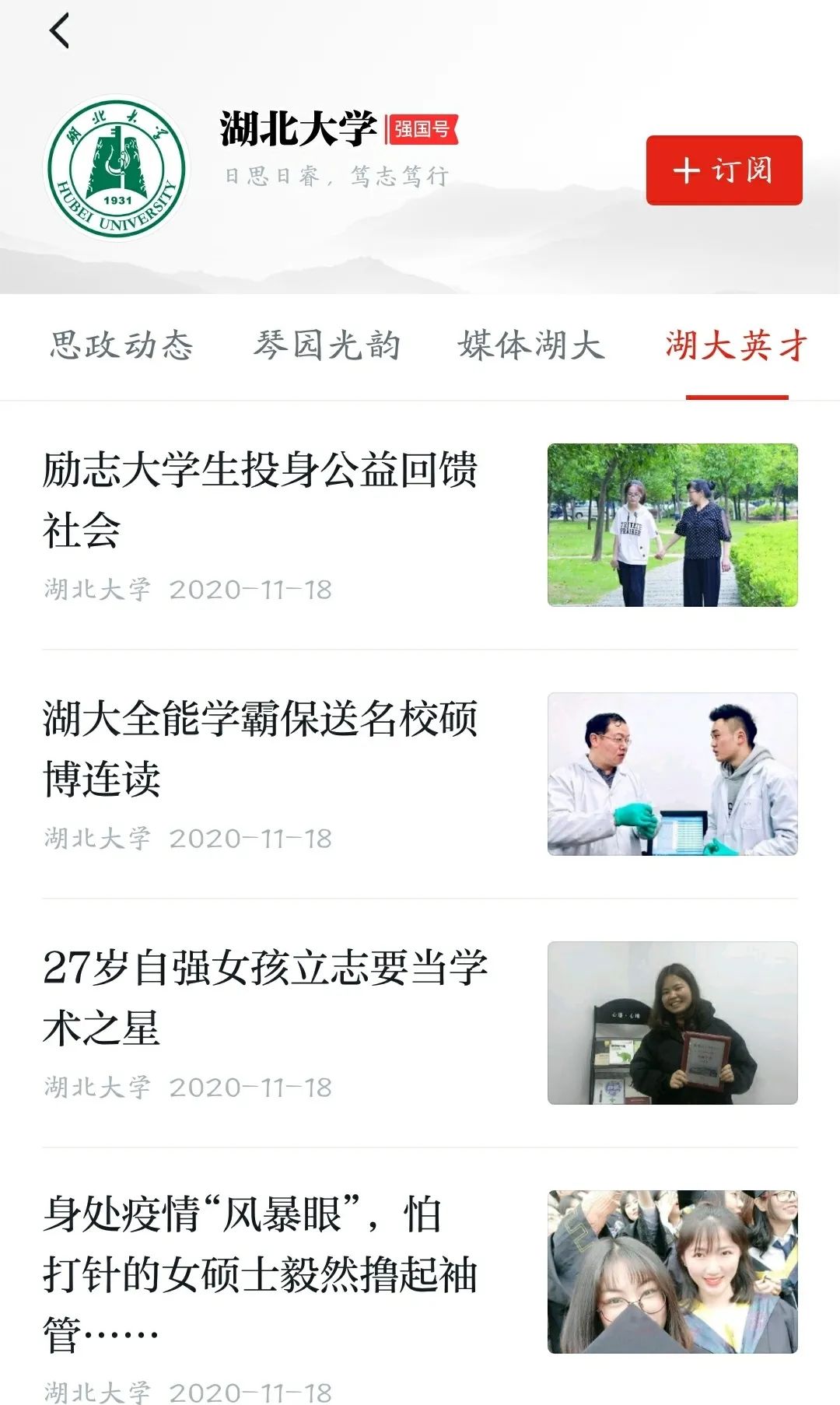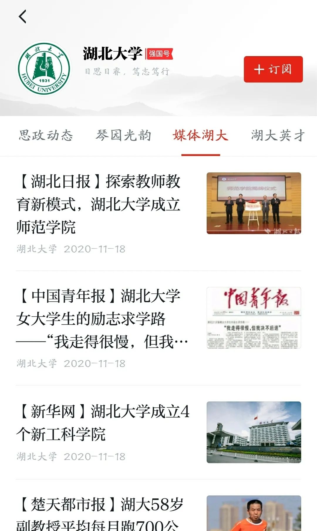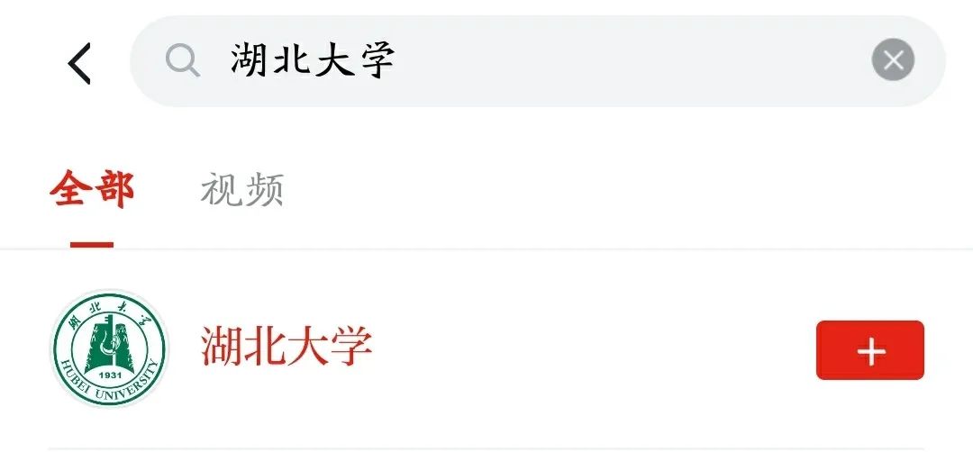 在搜索框输入“湖北大学”,点击“+”号进行订阅
