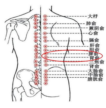 虚寒性胃痛、慢性胃炎、慢性腹泻、消化不良等,可选用上图中脾俞、胃俞及中脘、足三里等穴位,敷贴时间在4-6小时。