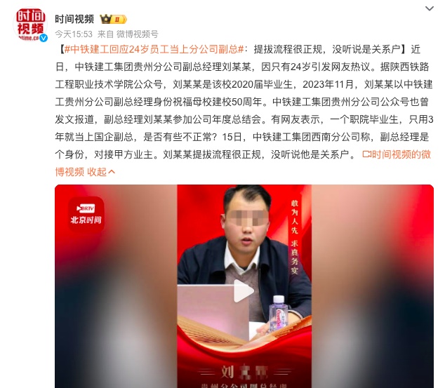 另据时间视频报道,15日,中铁建工集团西南分公司称,副总经理是个身份,对接甲方业主。该公司称刘某某提拔流程很正规,“没听说他是关系户。”