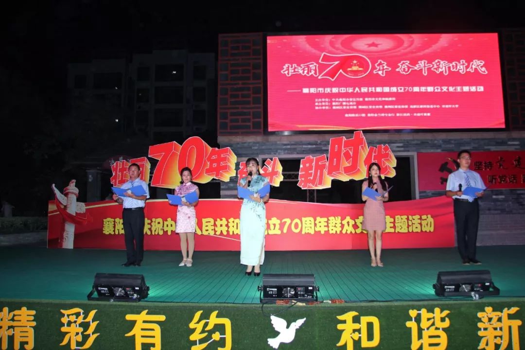 9月23号晚上,由中共襄阳市委宣传部、襄阳市文化和旅游局主办,襄阳广播电视台承办、襄城区委宣传部、樊城区委宣传部 、襄州区委宣传部、高新区新闻信息中心、市老年大学协办的“壮丽70年,奋斗新时代”襄阳市庆祝中华人民共和国成立70周年群众文化主题活动第四场走进檀溪湖社区,并与襄阳广电900平米演播厅正在进行主会场活动进行直播互动。