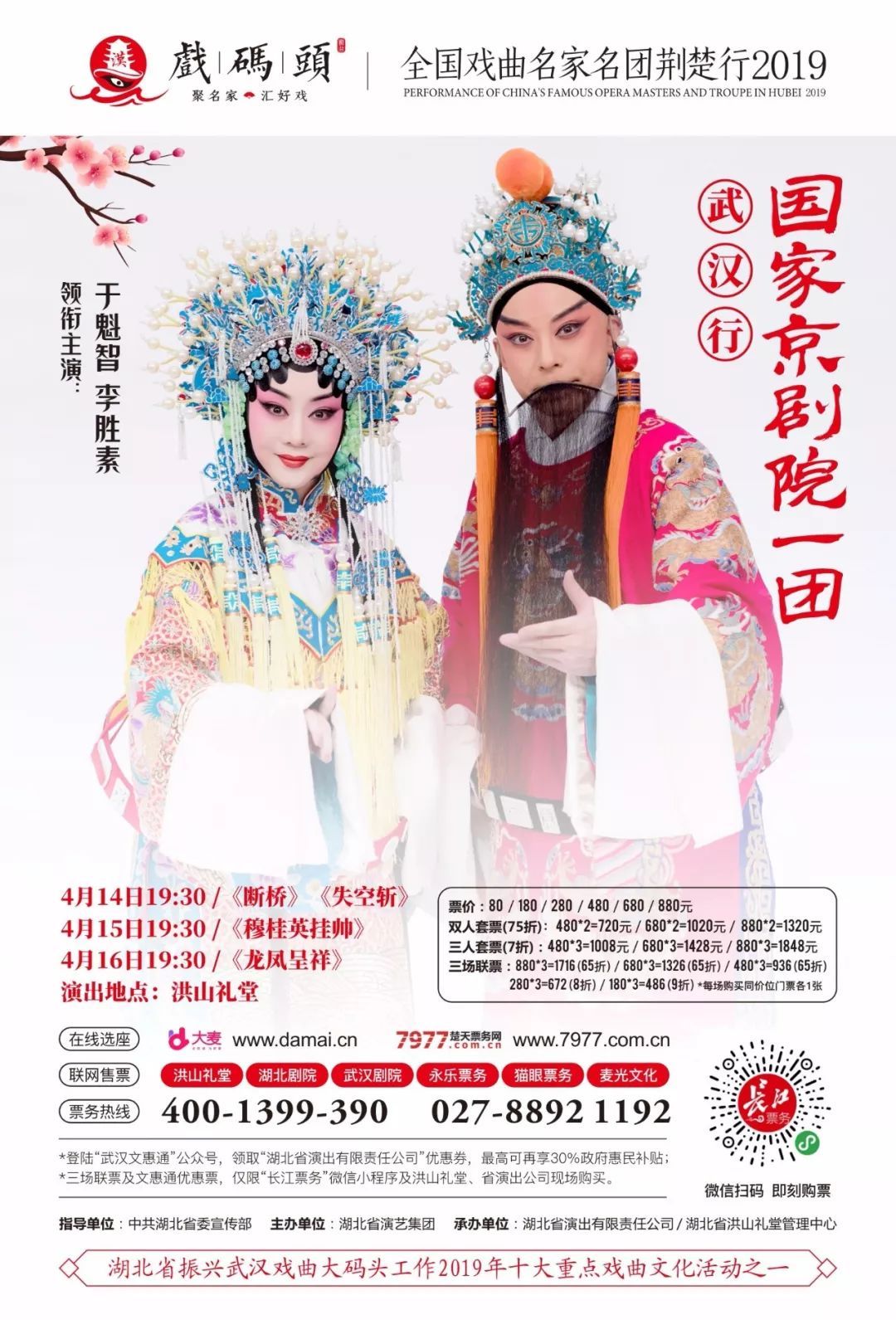 4月14日至16日,湖北省振兴武汉戏曲大码头工作2019年十大重点戏曲文化项目之一,“戏码头——全国戏曲名家名团荆楚行”将在洪山礼堂带来最顶级的京剧盛宴。“京剧第一老生”于魁智与“梅派青衣第一人”李胜素领衔国家京剧院,同台演绎《断桥》《失空斩》《穆桂英挂帅》《龙凤呈祥》四出经典名剧。
