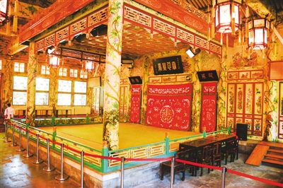 大戏楼、西洋门和后罩楼堪称恭王府建筑“三绝”。大戏楼建于同治年间(1862-1874),建筑面积685平方米,采用三卷勾连搭全封闭式结构,是中国现存最大的全封闭式清代戏楼。室内棚顶悬挂着20盏大宫灯,青砖地面上摆放着20套八仙桌与太师椅,高约1米的戏台上方挂着“赏心乐事”金字黑匾。戏台两侧大柱、四壁与顶部绘满缠枝藤萝,营造出绿叶森森、紫花盛开的景象,使人有在紫藤架下看戏的感觉。