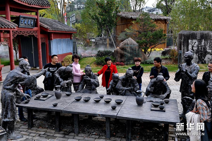 12月1日,游客在武夷山大红袍体验中心参观斗茶雕塑群。新华社记者 张国俊 摄