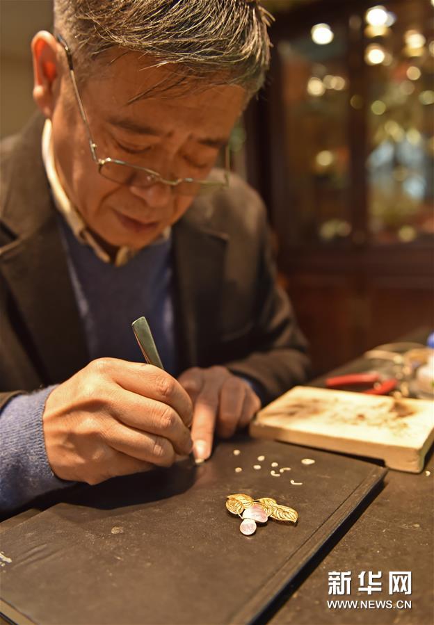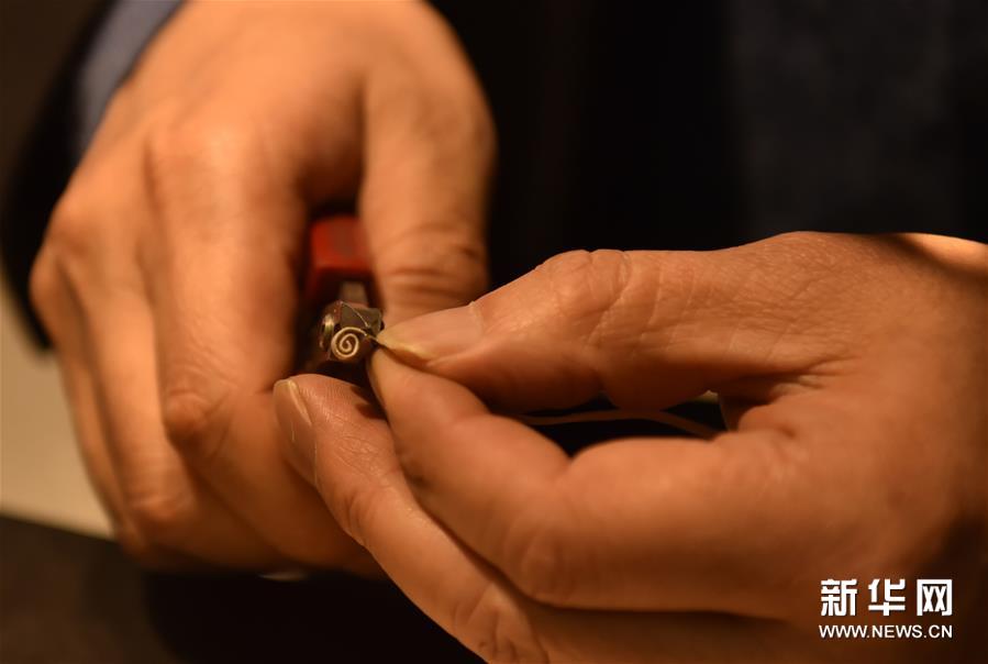 12月17日,董瑞京进行花丝镶嵌工艺制作。新华社发(陈钟昊 摄)