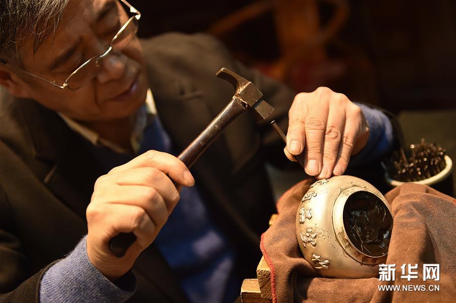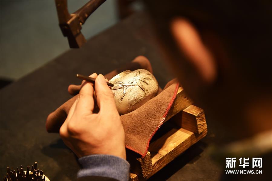 12月17日,董瑞京在银壶上錾刻竹叶。花丝镶嵌工艺又称细金工艺,是“燕京八绝”之一。传统的花丝镶嵌工艺用金、银等为原料,采用掐、填、攒、焊、堆、垒、织、编等技法,将金属丝制成千姿百态的造型,并采用锉、锼、镂、闷、砍、崩、挤、石、戗、镶等技法,将金属片做成碗或爪型凹槽,镶嵌不同种类的宝石。花丝镶嵌制作技艺是中国宫廷工艺的代表,2008年被列入国家级非物质文化遗产名录。 北京工艺美术大师董瑞京从事花丝镶嵌技艺30余年,其作品曾在中国工艺美术大师作品暨国际艺术精品博览会、全国工艺品交易会创新产品设计大奖赛中获得金奖。近几年,董瑞京积极参与到花丝镶嵌工艺进社区、进校园的推广活动,希望更多的人了解到这项传统技艺。与此同时,董瑞京认为花丝原材料贵重、花丝造型耗时、焊接火候难掌握、錾刻工具较复杂是花丝镶嵌工艺的难点,这些在一定程度上限制了传统技艺的现代传承,目前他正致力于花丝镶嵌在银制品实用器的研发和制作。新华社发(陈钟昊 摄)