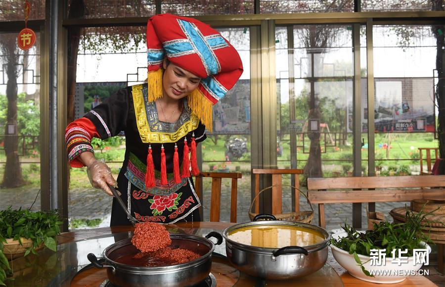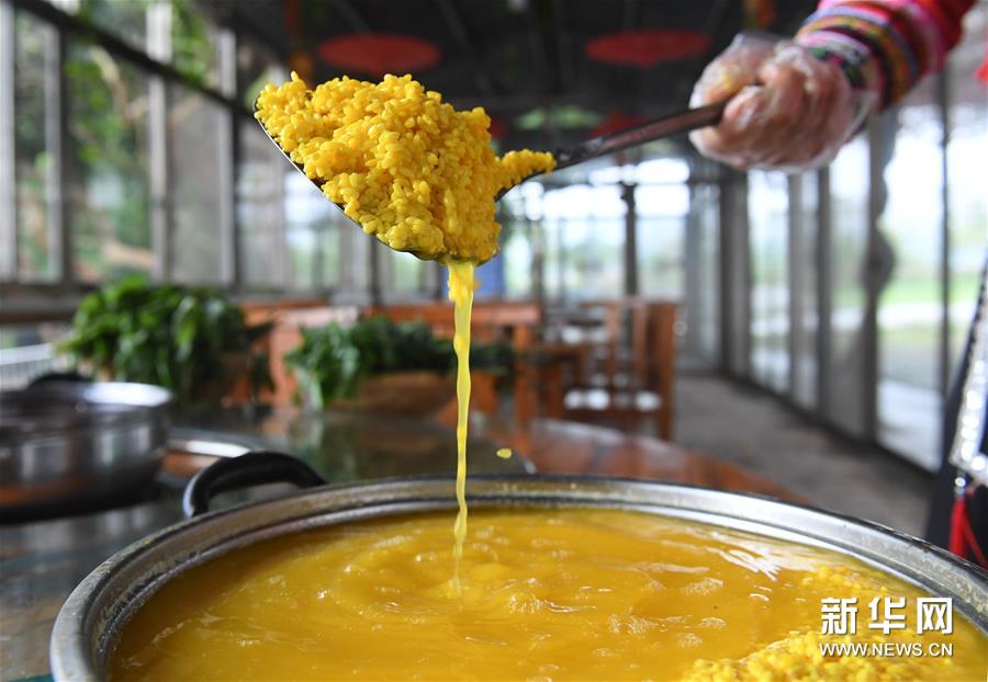 3月25日,在广西上林县巷贤镇,一名壮族村民在准备做五色糯米饭。新华社记者 陆波岸 摄