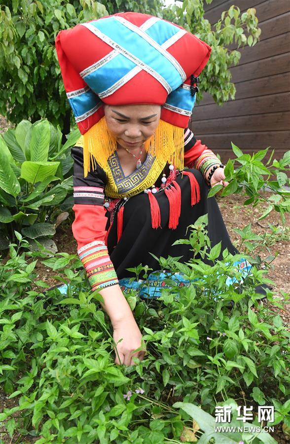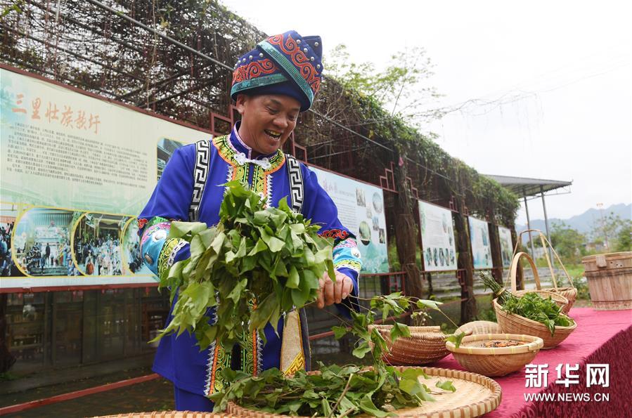3月25日,在广西上林县巷贤镇,一名壮族女子在采摘给糯米染色所需要的植物。新华社记者 陆波岸 摄