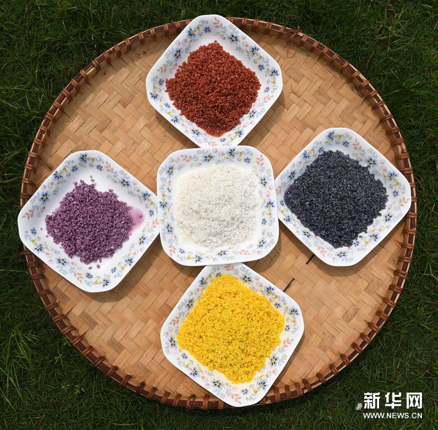 这是不同植物萃取色素浸泡后的糯米和原色糯米(3月25日摄)。新华社记者 陆波岸 摄