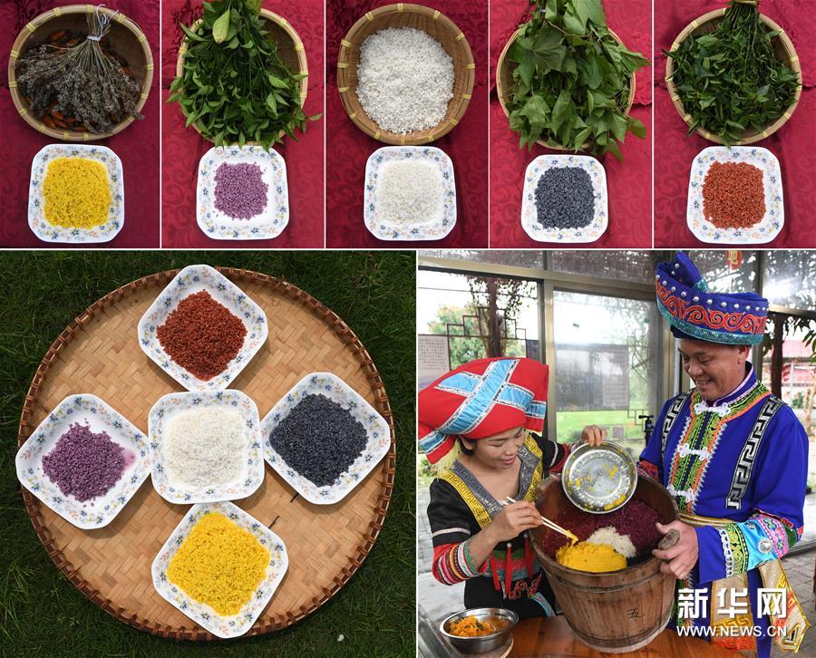 上五图:4种不同植物及其色素染成的糯米和原色糯米;下左图:4种不同植物色素染成的糯米和原色糯米;下右图:在广西上林县巷贤镇,两名壮族村民在查看一桶刚刚蒸熟的五色糯米饭(拼版图片,3月25日摄)。 每年“壮族三月三”到来之际,广西的壮族同胞都有蒸制五色糯米饭迎接节日的习俗,以祈祷五谷丰登,五福临门。这些五色糯米饭,主要采用天然植物萃取色素,将糯米分别浸泡到紫、黄、红、黑4种不同植物色素的水里,充分染色后,与原色糯米一起蒸熟而成。色泽鲜艳、清香诱人的五色糯米饭,是“壮族三月三”接待来客时必不可少的传统美食。新华社记者 陆波岸 摄