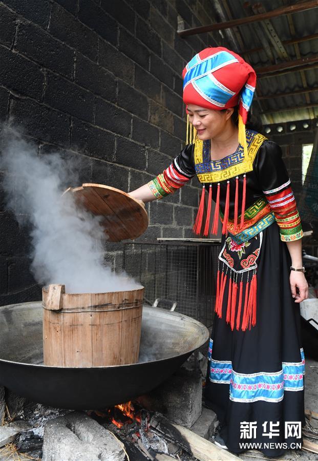 3月25日,在广西上林县巷贤镇,一名壮族女子在蒸制五色糯米饭。新华社记者 陆波岸 摄