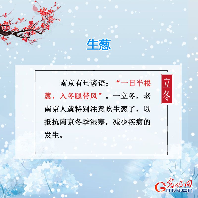 生葱。南京有句谚语:“一日半根葱,入冬腿带风。”一立冬,老南京人就特别注意吃生葱了,以抵抗南京冬季湿寒,减少疾病的发生。