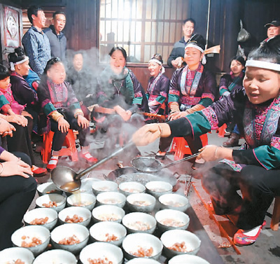 歌声架起连心桥,在侗家人传统的“吃冬节”,吴纯娟(前排中)同燕茶村村民围坐火塘边,一边打油茶一边唱起侗族大歌。
