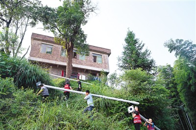 驻村干部和村民一起搬运路灯的灯杆,一点一滴的改变让这里旧貌换新颜。