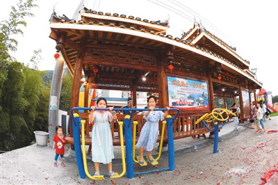 近几年,民俗文化广场、文化长廊、鼓楼、健身小广场、太阳能路灯……帮扶单位为村里援建的一批民生项目陆续启用,村容村貌大为改观。图为几名小朋友在文化长廊前的健身器材上玩耍、健身。