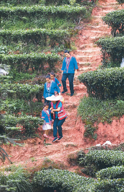 在燕茶村千亩茶园,吴纯娟(前)与村民从茶山劳作归来。