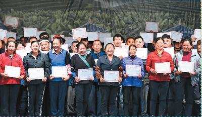 今年4月21日,燕茶村131户脱贫户代表展示他们刚拿到的《脱贫光荣书》。