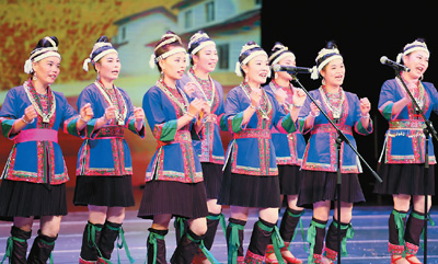 歌声唱出心声,在柳州市文化艺术中心,粟丽(左三)、吴培孟(左五)等“燕之声”文艺队员用侗族大歌唱响燕茶村在脱贫攻坚中的变化。