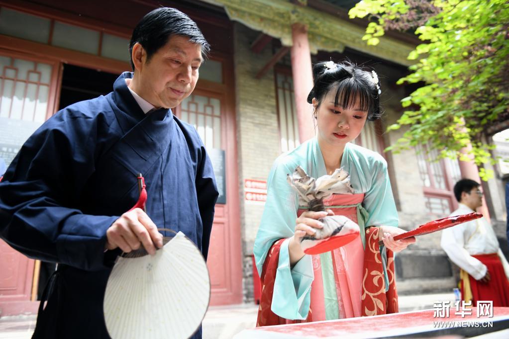 4月14日,汉服爱好者在西安碑林博物馆参加上巳节雅集活动。
