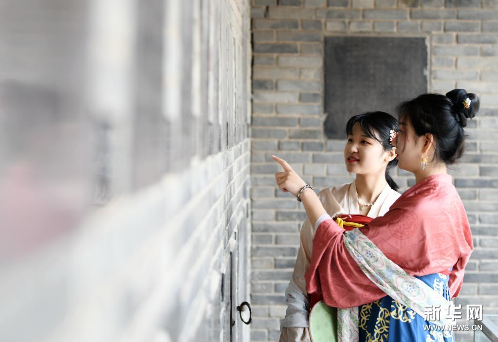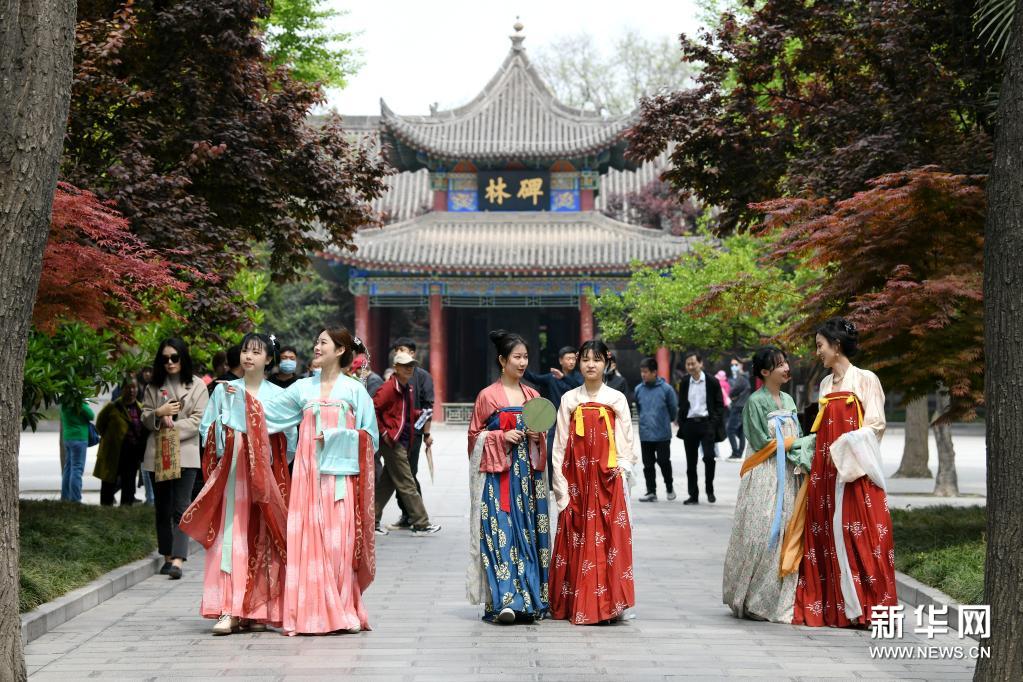 4月14日,参加上巳节雅集活动的汉服爱好者在西安碑林博物馆参观。新华社记者 李一博 摄