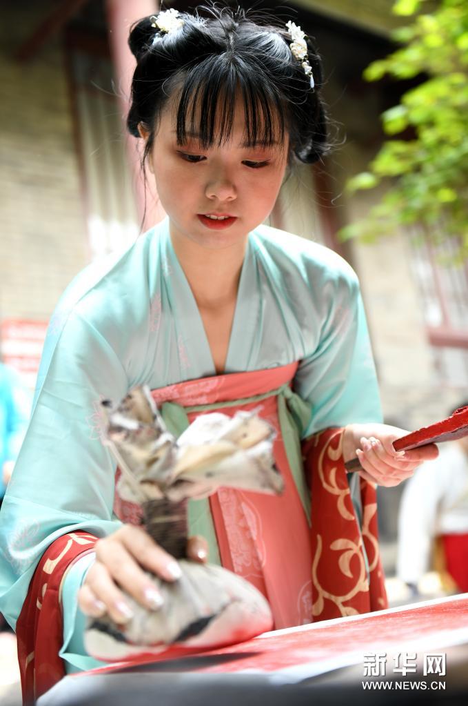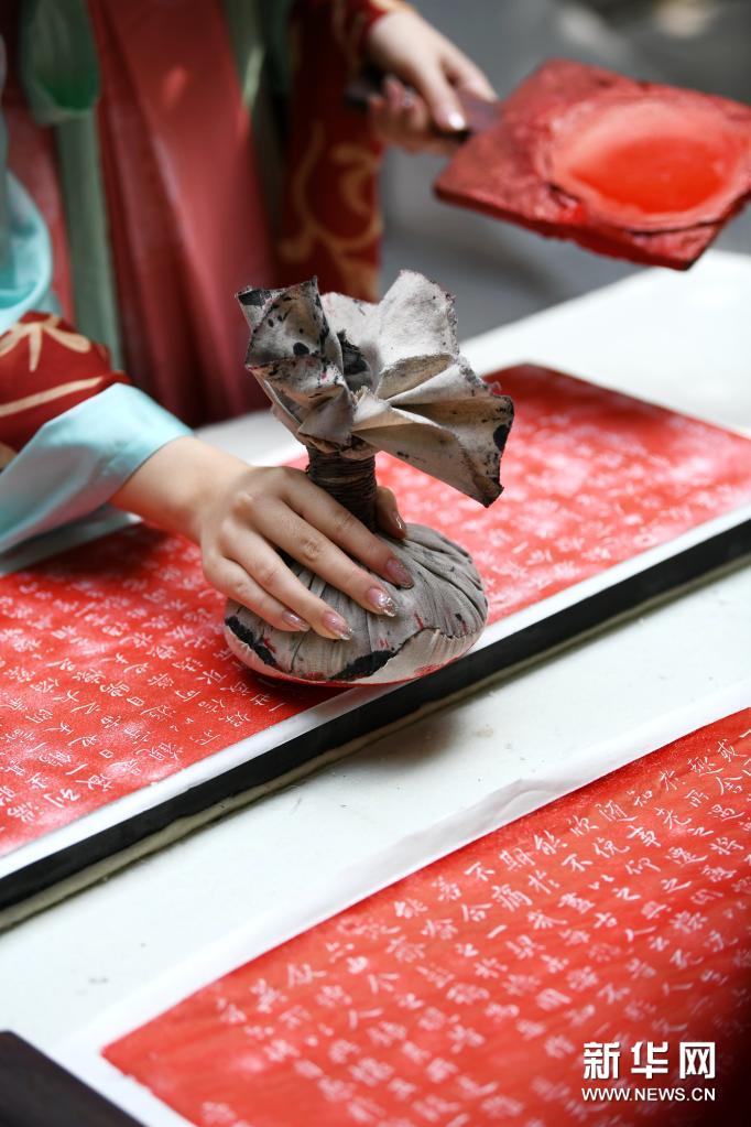 4月14日,汉服爱好者在西安碑林博物馆上巳节雅集活动上体验拓印。新华社记者 李一博 摄