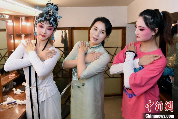 演出前,福建省实验闽剧院院长周虹(中)为闽剧青衣新秀文焱(右)、严慧馨(左)示范戏剧表演动作。 记者刘可耕 摄