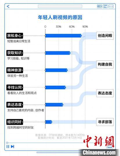在《年度观察》中,“年轻人刷视频的原因”划分为“创造闲暇”、“构建自我”、“表达态度”和“寻求部落”四大类。8成受访者认为,在视频里能放松身心,短暂逃离生活琐碎,而同时也有超5成受访者认同自己可以通过视频来体验另一种生活。