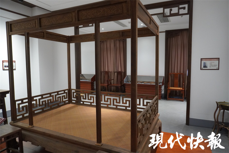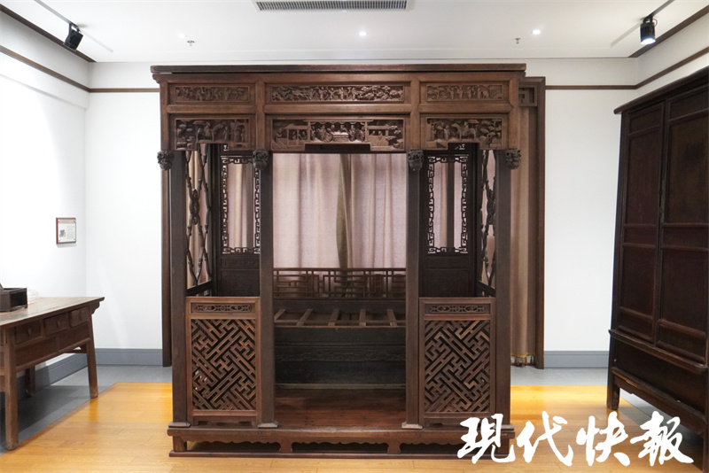 “镇馆之宝”是一张清中期的金丝楠木拔步床。这张拔步床采用了典型的通作工艺,除踏板、床顶板、床楞外,其他全为上等金丝楠木制作。门面采用斜万字纹双面洼线工艺,床顶边沿采用浅浮雕、深雕、圆雕等多种工艺,人物雕刻得活灵活现,刻画了状元及第、八仙过海、五子登科等故事。床顶还设有两个挂钩,是新婚时挂红灯笼用的。“这是当年的大户人家所有,品相工艺极佳。”陈云说,拔步床有着很强的私密性,设置有子孙桶、衣柜等,生活起居都可以在内部完成。