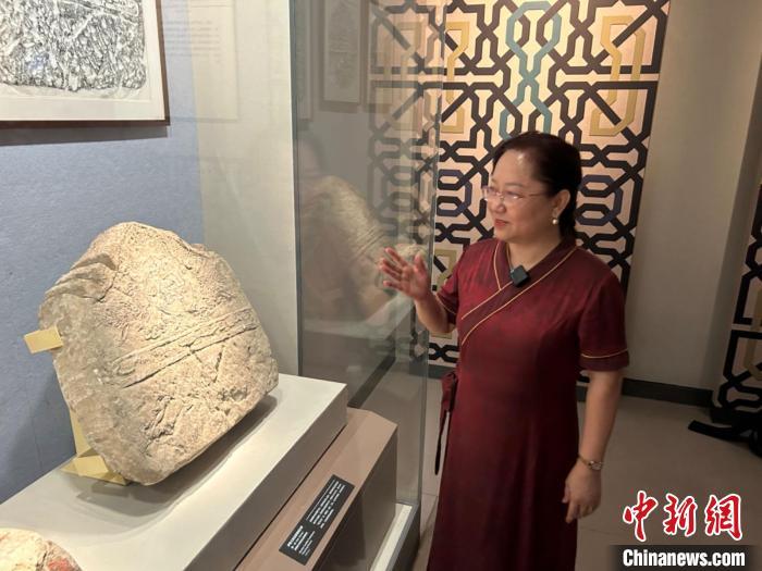 图为海南省博物馆研究馆员王静介绍珊瑚石墓碑的来源。符宇群摄