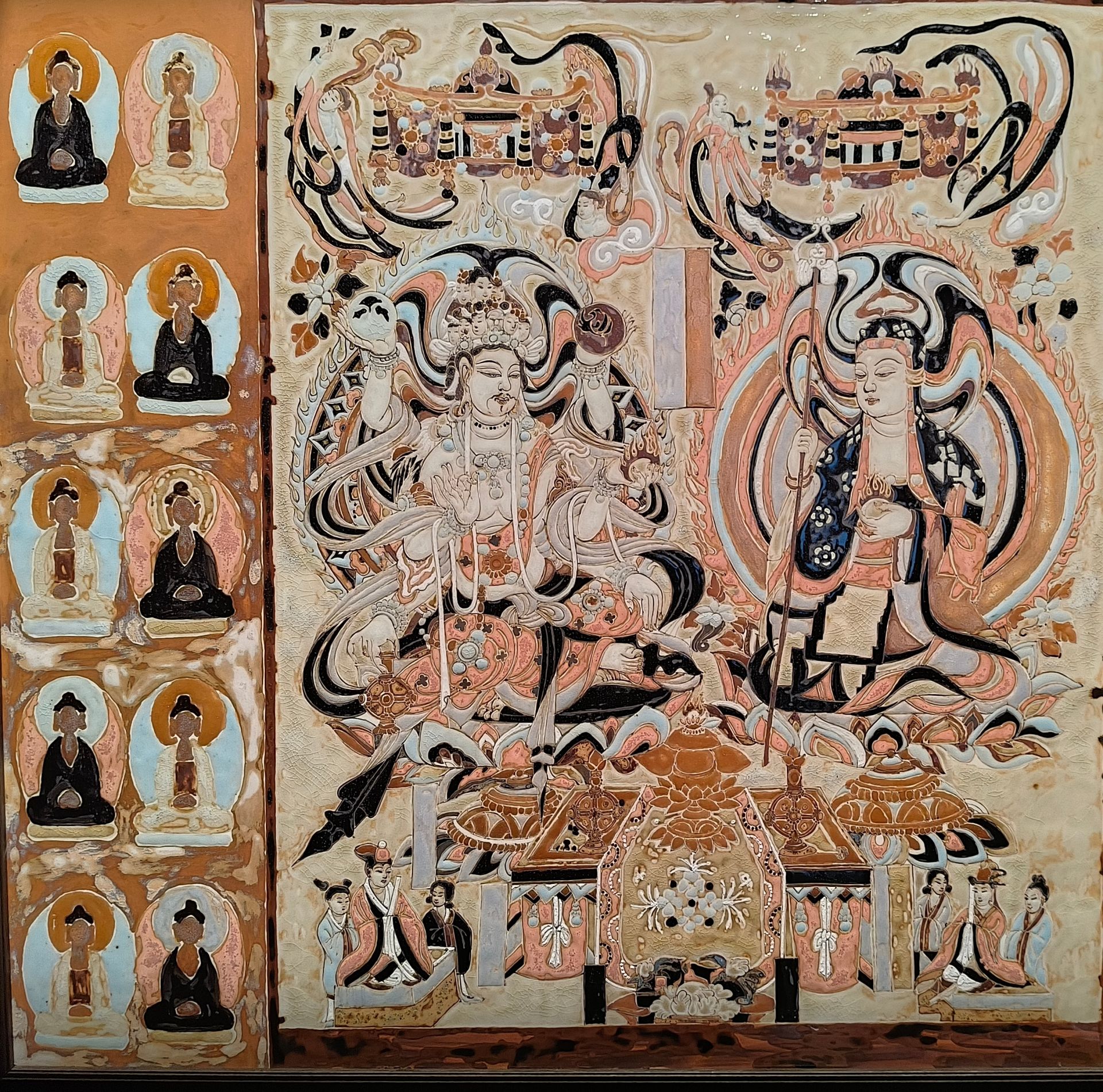 经过无数次配方调整与烧制试验,范敏祺团队创新性地将高温颜色釉与釉下彩绘相结合,精准复原了四个不同时代、各具特色的敦煌石窟。