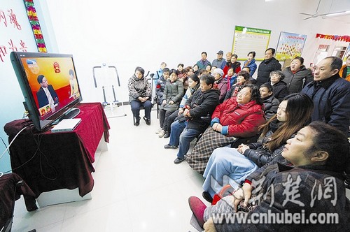 图为:百步亭社区居民关注两会直播