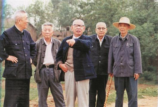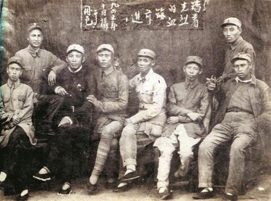 图为:1945年10月组成湘鄂赣游击地委时,罗通(前排右二)与战友们