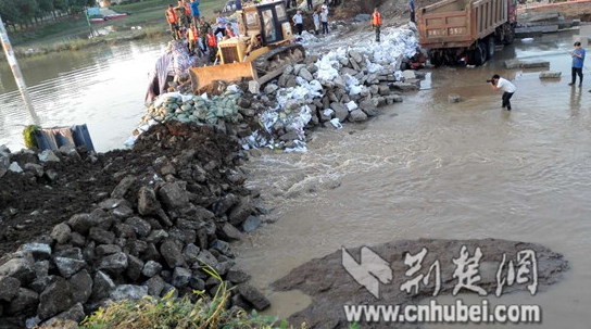 7月23日清晨6点,经过武警水电部队200余名官兵及当地300多名干部群众9个小时的奋战,孝感市孝南区东山头东风垸沦河二路二道防线溃口完成封堵。