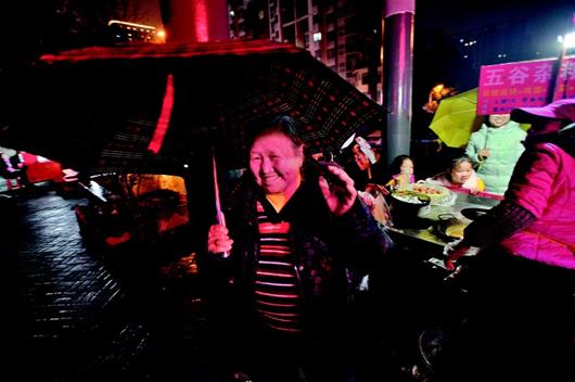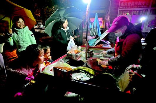 风雨中,汪天姣的煎饼摊前,前来的买饼人仍然络绎不绝。他们的身影,给这江城的冷雨夜,平添一份温暖。