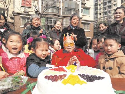 楚天金报讯 图为:社区组织居民给肖金荣婆婆过生日