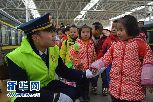 春运第一天,成都铁路局贵阳客运段上海车队组织休班乘务员组成“绿背心”服务小组,为进站上车的重点旅客提供引导、问询等温情服务。图为一名“绿背心”热情和自己所服务的小朋友交流,当得知这是一群赴京参加演出的基层幼儿园的学生时,脸上露出惊喜的表情。新华网发(杨光忠 摄)