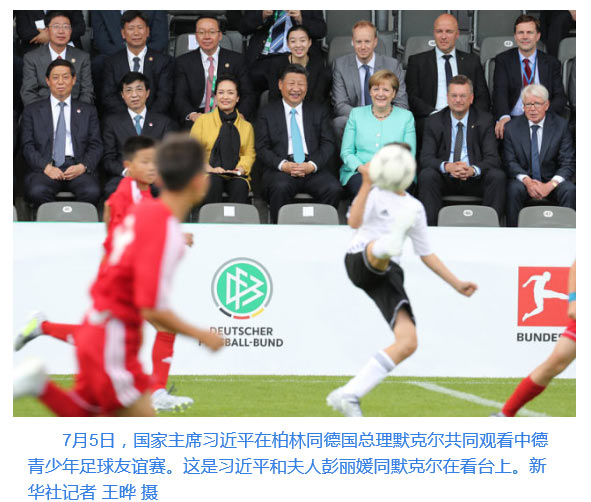第三个场景,柏林奥林匹亚体育场,阳光明媚,绿草茵茵。习近平主席和默克尔总理饶有兴致地观看中德青少年足球队友谊赛。习近平主席对两国小运动员说:“你们是中德足球事业发展的希望,也是中德两国友好合作事业的接班人。”