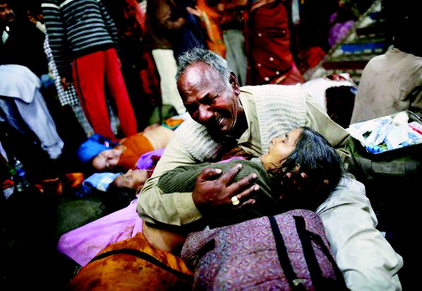 湖北日报讯 图为:一名印度民众抱着遇难的亲人痛哭。(据环球网)