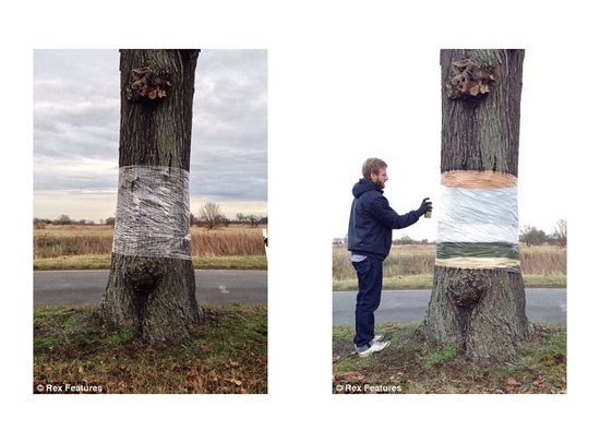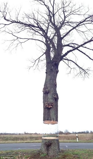 两名德国美术设计师巧妙创作出光幻觉的奇景,看上去仿佛一棵大树的一段树干“被砍”,而上部树干依然挺立,如气球般在空中漂浮。
