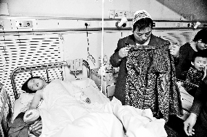 在儿科骨科的病房内,记者见到李明权和妻子黄章兰。李明权上身只套了一个外套,拉链半敞着,头上戴着纱网,头顶的纱布已被血浸透,双眼红肿,鼻梁、胸前有伤,耳根和双手血迹斑斑,妻子黄章兰一脸疲态。床脚边的椅子上堆着李明权脱下的衣服,衣服上全是血。小悦睡着,右手手腕被厚厚的纱布缠着,露出三根指头,指甲缝里都是血。