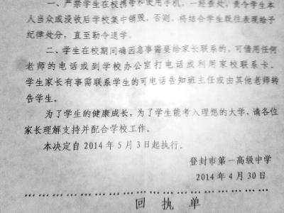 一位读高一的男生称,半个月前,学校出台严禁学生携带使用手机规定,并和学生家长们签署协议。这份规定大意是说,近来我校学生使用手机有所抬头,根据其他学校经验并结合我校实际,特规定学生入校之后严禁携带、使用手机,若发现一律没收并公开销毁。如果学生拒不交出,视情节给予处分直至勒令退学。从5月3日起,这项规定付诸实施。每天早晚,学校领导及班主任等老师,不定时巡查,“一旦发现,手机立即没收。就连苹果、三星等价值几千元的手机,也照样没收”。