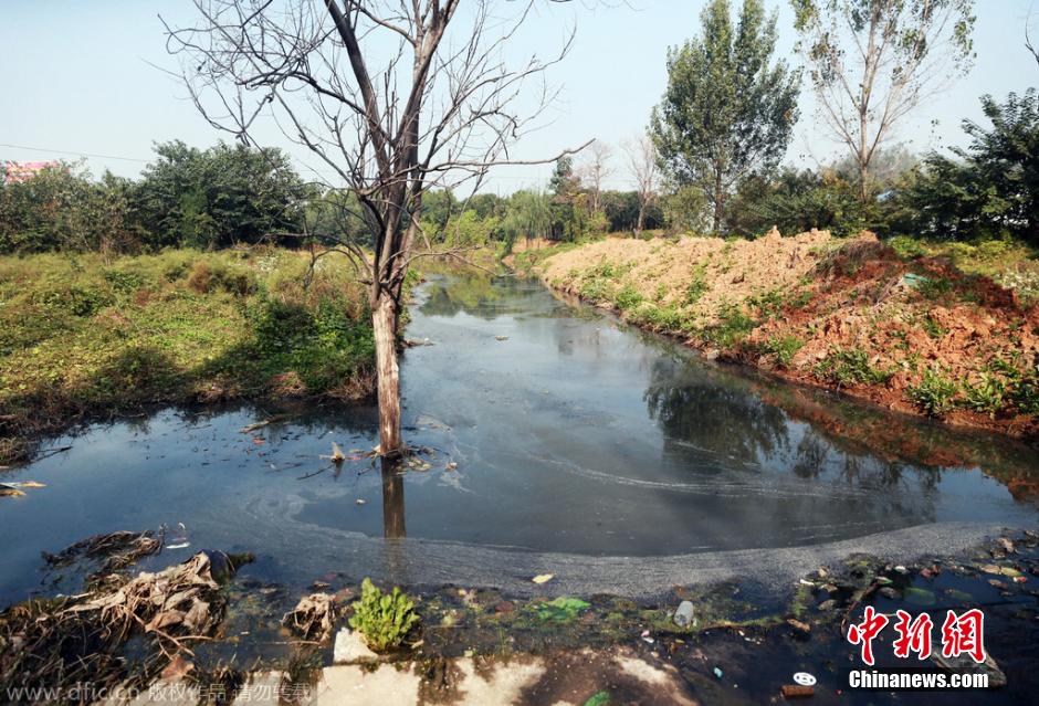 记者看到,原本供行人和车辆行走的水泥路被污水“阻断”,为了方便行走,行人在污水中放置了十数块砖头。污水面约有四五米宽,往北看,上游似乎是一条新挖的渠沟,水流并不快,水中是各种垃圾、青苔以及虫子,几棵树稀拉拉地浸泡在水中,已经完全枯死。