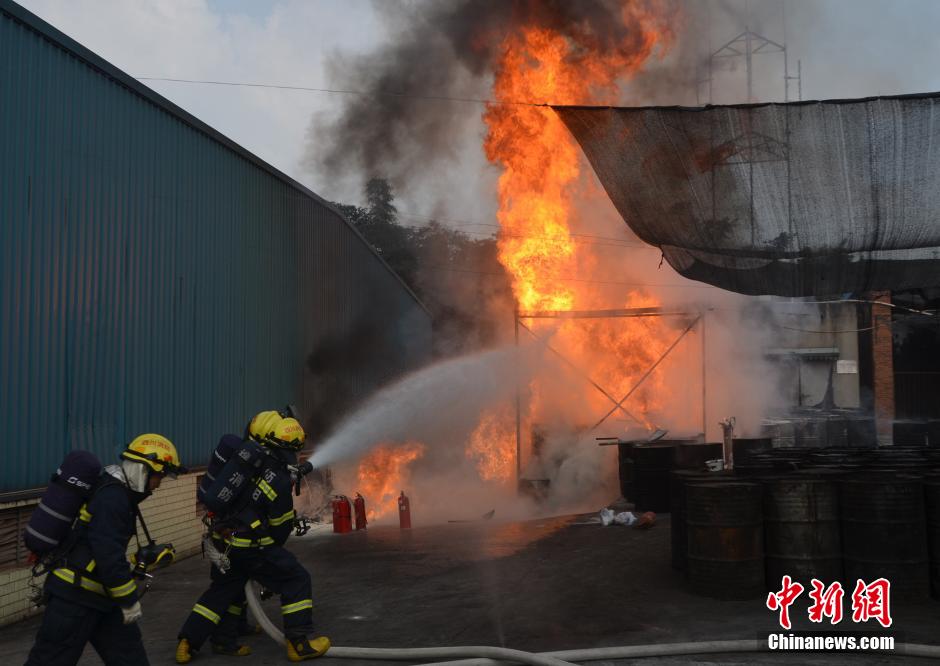 10月20日,四川绵阳市一饲料厂发生火灾,位于露天油脂灶上的6个装满猪油的油桶猛烈燃烧,火焰达到5米多高,起火点左侧是一栋放着大量粮食的仓库,右侧还存放着十余桶猪油,随时都有引起大面积燃烧的可能。绵阳市119指挥中心接到报警后,立即调派特勤中队赶赴现场处置。经过消防官兵的奋力扑救,大火被成功扑灭。 中新社发 田猛 摄