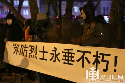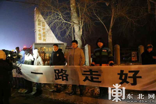 5时30分,记者在位于科研路的路口看到,在哈尔滨-20度的冰冷里,约有上千名自发组织的掉念的市民及数十家爱心企业站成一排,条幅上写着“英雄走好”等祭奠词语,在沿途街道送烈士最后一程。